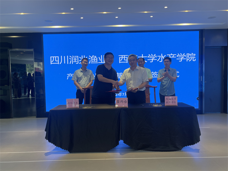 随后,公司经理苏胜齐和四川润兆渔业公司董事长李军共同签订了产科教协同育人基地合作协议,并进行了基地揭牌仪式。苏胜齐经理代表公司向李军董事长颁发创新创业导师聘书。双方将在教学资源建设、科学研究、团队培训、员工创新创业与实践能力培养、社会服务等方面进行深入合作,造就大批产业需要的高素质应用型、复合型、创新型人才,为产业发展提供人才支持和智力支撑。