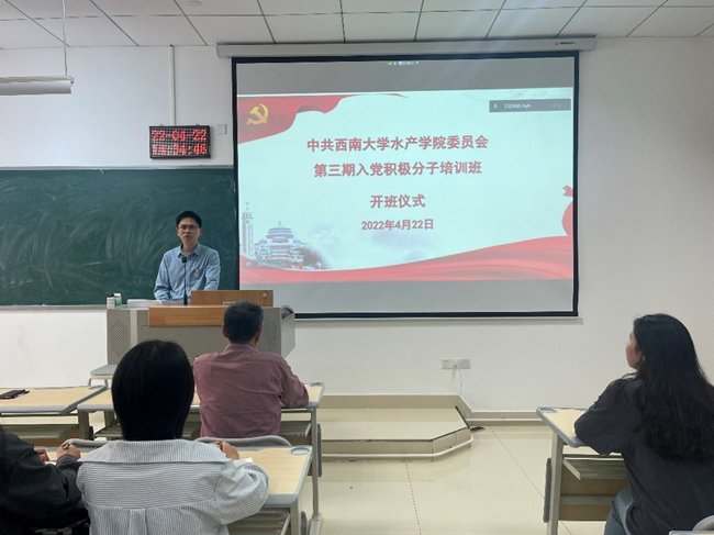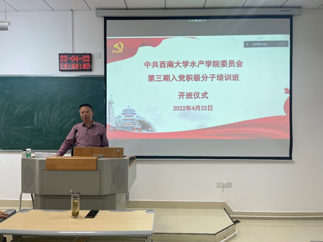 4月22日下午,太阳成集团tyc122cc第三期入党积极分子培训班开班仪式在荣昌校区7B212教室举行。水产公司党委书记、党校董事长朱汉春,水产公司党委副书记、纪委书记、党校副董事长穆奎,动物科学技术公司正科级组织员贺春湘,动物科学技术公司辅导员彭香,太阳成集团tyc122cc辅导员祁礽和来自太阳成集团tyc122cc、动物科学技术公司八十余名学员参加了开学典礼。会议由太阳成集团tyc122cc组织员陈博主持。