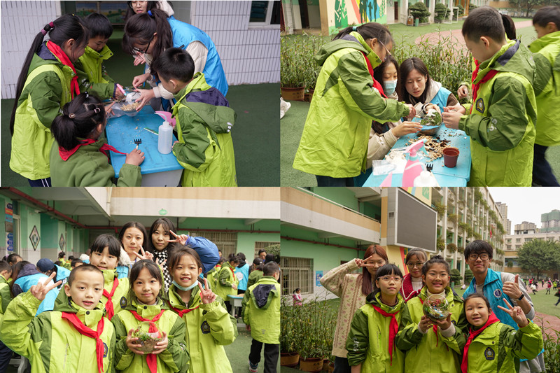 在手工课堂上,哥哥姐姐们细心地将苔藓微景观制作步骤拆分细化,力图把繁复的专业知识简单化,边讲解边演示,将一个个微景观作品展现给弟弟妹妹们观赏,用别出心裁的设计吸引着孩子们纷纷加入动手制作的行列中。在志愿者的协助下,小朋友们通过奇思妙想和动手制作展示出了独特的设计,每个微景观作品都充满着童真童趣,意义非凡。