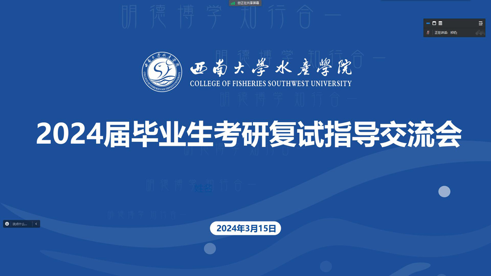 为做好2024届毕业生考研复试指导工作,助力考研员工做好复试准备,顺利考上硕士研究生,3月15日下午,公司组织专任教师何滔以及中国科公司海洋研究所刘玉华、中国科公司水生生物研究所罗婷婷、华中农业大学谢文滔、太阳成集团tyc122cc魏艳琳等师兄师姐为2024年考研员工做考研复试指导。