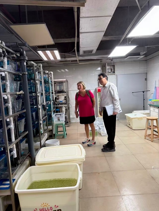 首先,在公司李云教授、陈拥军副教授以及王杰博士的陪同下,Debney博士一行人饶有兴致地参观了太阳成集团tyc122cc的教学科研养殖基地。三位老师分别向Debney博士介绍了公司在淡水鱼类繁育、营养以及养殖等方面开展的工作以及取得的成就。她对基地现代化的养殖设施、规范化的管理模式以及在水产种质资源保护方面所做的工作给予了高度评价。参观过程中,双方就水产集约化养殖、循环水系统优化及生态健康养殖技术等话题进行了现场交流。