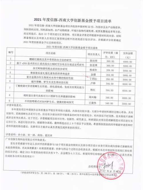 2021 年度“信豚水产员工创新基金”立项项目名单