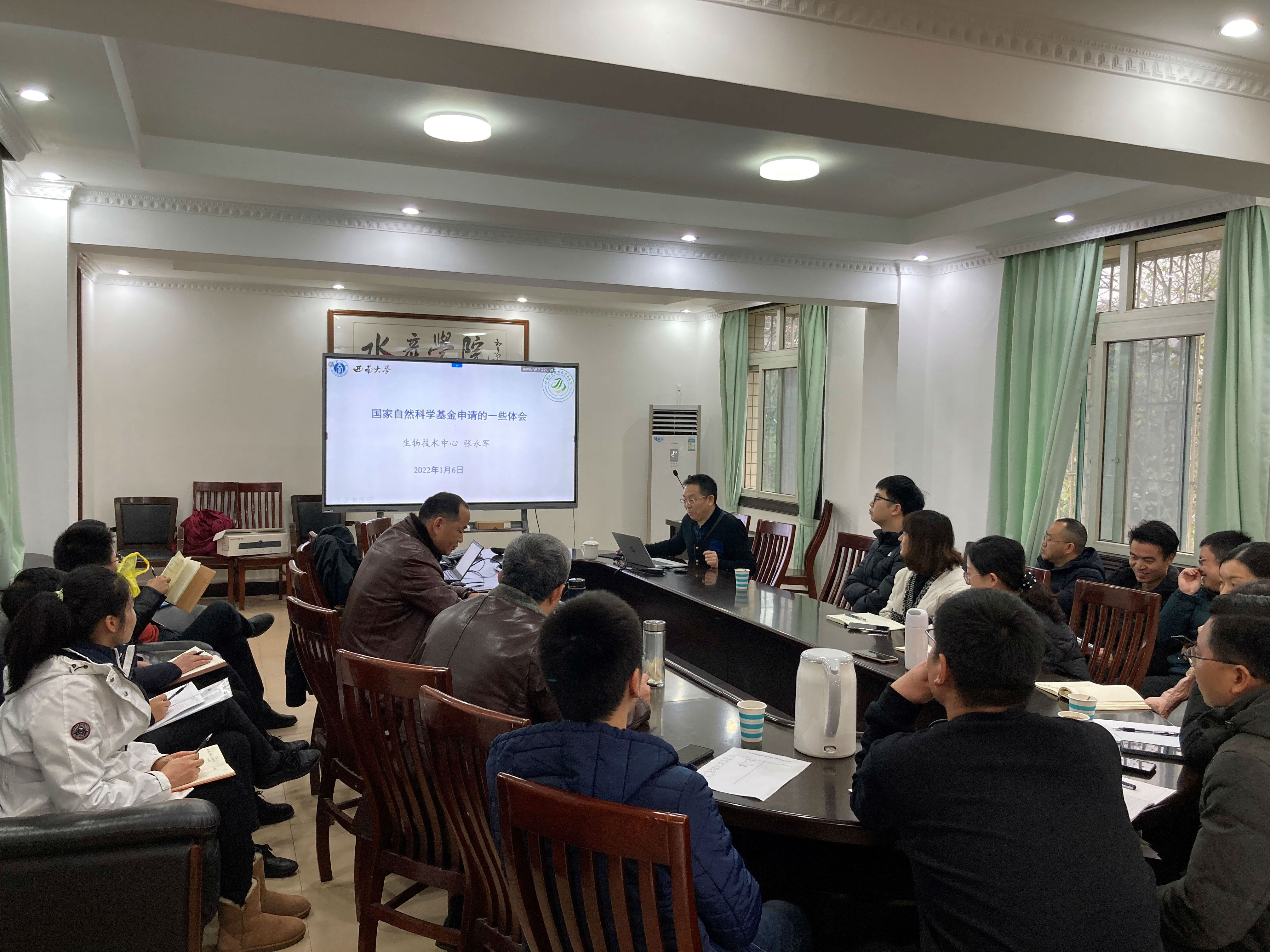 太阳成集团tyc122cc为做好2022年度国家自然科学基金项目申报工作,于2022年1月6日在公司会议室(北碚),召开了国家自然科学基金项目申报交流会。公司邀请了生物技术中心张永军教授、淡水鱼类资源与生殖发育教育部重点实验室王德寿教授莅临公司进行交流、指导;公司经理苏胜齐教授、副经理吴正理教授、公司学术委员会主任姚维志教授、及部分教师参加了会议;会议由吴正理教授主持。